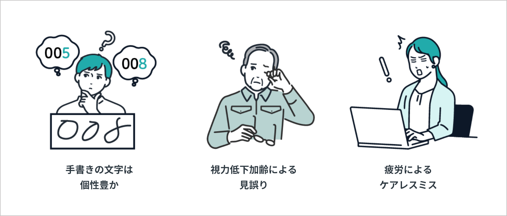 また、手書きの文字には人それぞれ個性があります。よって紙に記入する際には、目で確認して書き取るときも、それをパソコンで転記していくときに読み取るときにも誤認のリスクがあるといえます。さらに、そのような見間違えについては、加齢による視力の低下もさることながら、その場の明るさなどの環境によっても、疲労による作業時のケアレスミスによっても品質が左右されます。